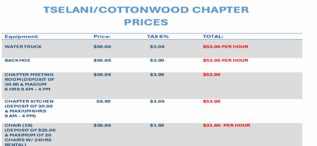 The Tselani/Cottonwood Chapter provides essential services to the community, including water purchases, trash disposal, housing assistance, and a Summer Youth Employment Program. These resources are available to residents at an affordable cost, with housing support aimed at those in need. The chapter also offers job opportunities through its employment program, with the requirement that applicants must have been registered with the chapter for at least six months. This ensures a strong connection to the community and eligibility for available services. For more information or to access these services, community members can visit the chapter administration.